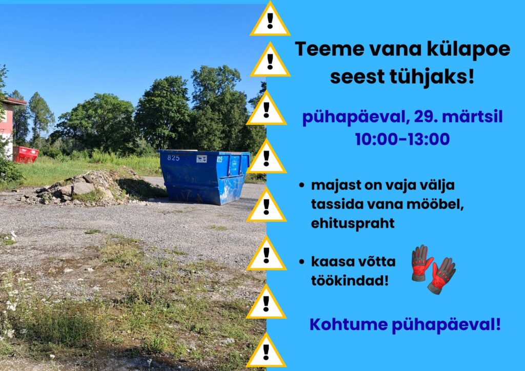 Teeme tulevase raamatukogu ja kogukonnakeskuse korda! / Uncategorized / By Kristi Sarap Tule pühapäeval, 29. märtsil ja aita teha tulevane raamatukogu ja kogukonnakeskus korda!Vanakülapoe sees on palju ehitusprahti ja vana mööblit, aitame üheskoos ruumi tühjaks teha. Konteinerid ootavad tühjendamist, võta töökindad kaasa ja tule appi!